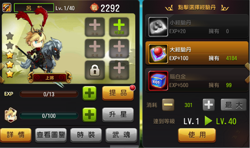           英雄通過收集品質丹提高品質,品質越高則需要越高級的品質丹;