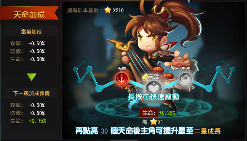 天命是提升主角能力的系統,每次激活星宿需要消耗壹定的星星,星星通過關卡中的戰鬥評級來獲得,1BOSS關卡可獲得最高3星評級既是3個星星。